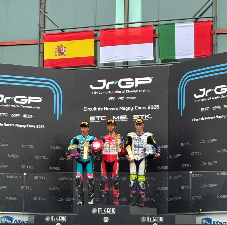 JAKARTA, Pesisirtimur.com – Pebalap binaan PT Astra Honda Motor (AHM) kembali cetak sejarah untuk Indonesia. Setelah sebelumnya Veda Ega Pratama menang di RedBull Rookies Cup (RBRC) Italia, saat ini giliran M. Kiandra Ramadhipa yang tampil memukau dalam gelaran FIM JuniorGP World Championship yang berlangsung di sirkuit Magny-Cours, Prancis pada 5-6 Juli 2025. M. Kiandra Ramadhipa berhasil melaju kencang dan mencetak sejarah dengan meraih podium tertinggi dalam race pertama balap European Talent Cup (ETC). Raihan Ramadhipa sekaligus menjadi prestasi pertama pebalap Indonesia di balapan bergengsi benua Eropa ini.