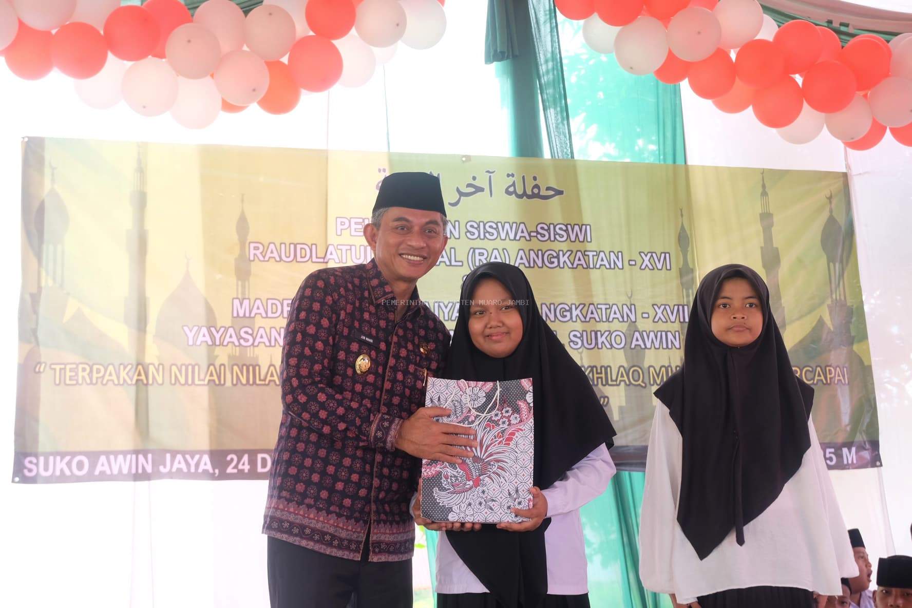 MUARO JAMBI – Wakil bupati kabupaten muaro jambi junaidi h mahir menghadiri undangan pelepasan siswa-siswi raudhatul athfal dan madrasah ibtidaiyah darul amal yang bertempat halaman gedung madrasah ibtidaiyah darul amal rt.002 desa suko awin jaya, Sabtu (21/06/2025).